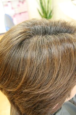 白髪もあるので、隠しながら尚且つ既染部の明るさを下げないように・・・